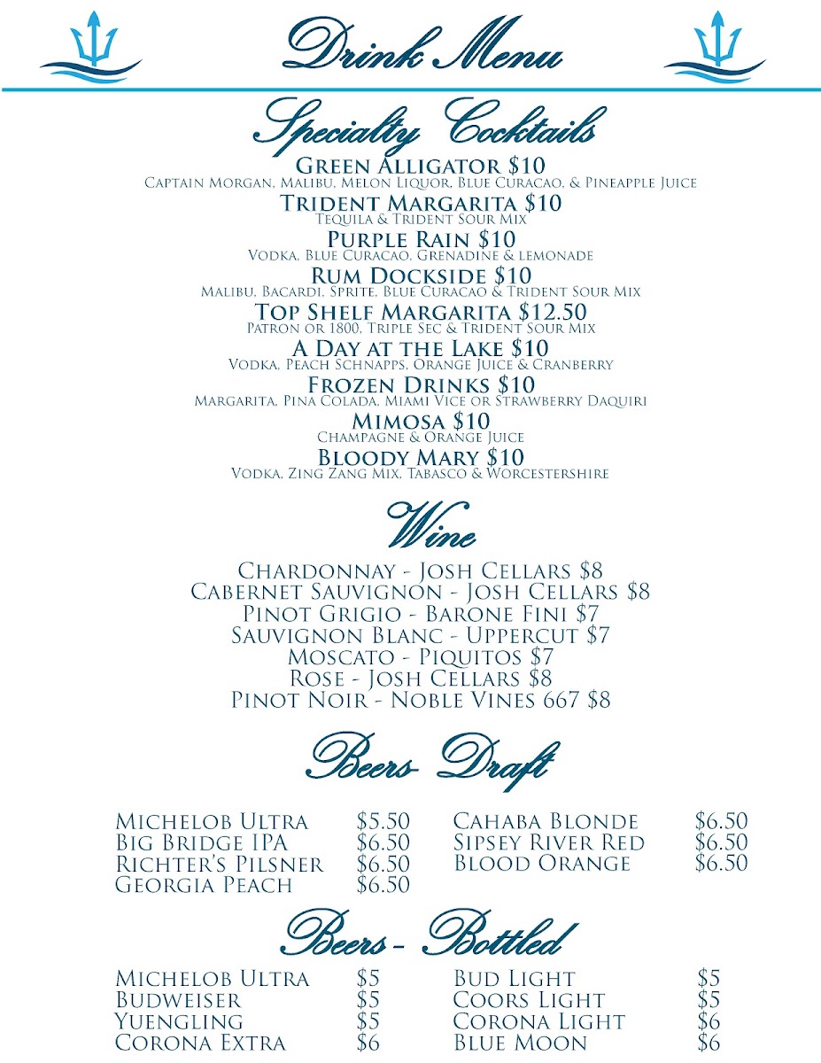 Enjoy the scenic views from their covered outdoor dining area or take advantage of the ample boat parking. With a menu rich in variety and options for families, The Grille at Trident Marina is not just a meal; it’s an experience. Come savor the good food, good vibes, and a slice of life by the lake!